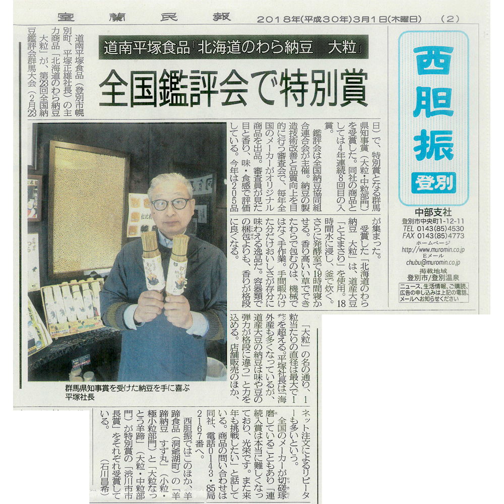 また、2018年3月1日の「室蘭民報」にも掲載されました。